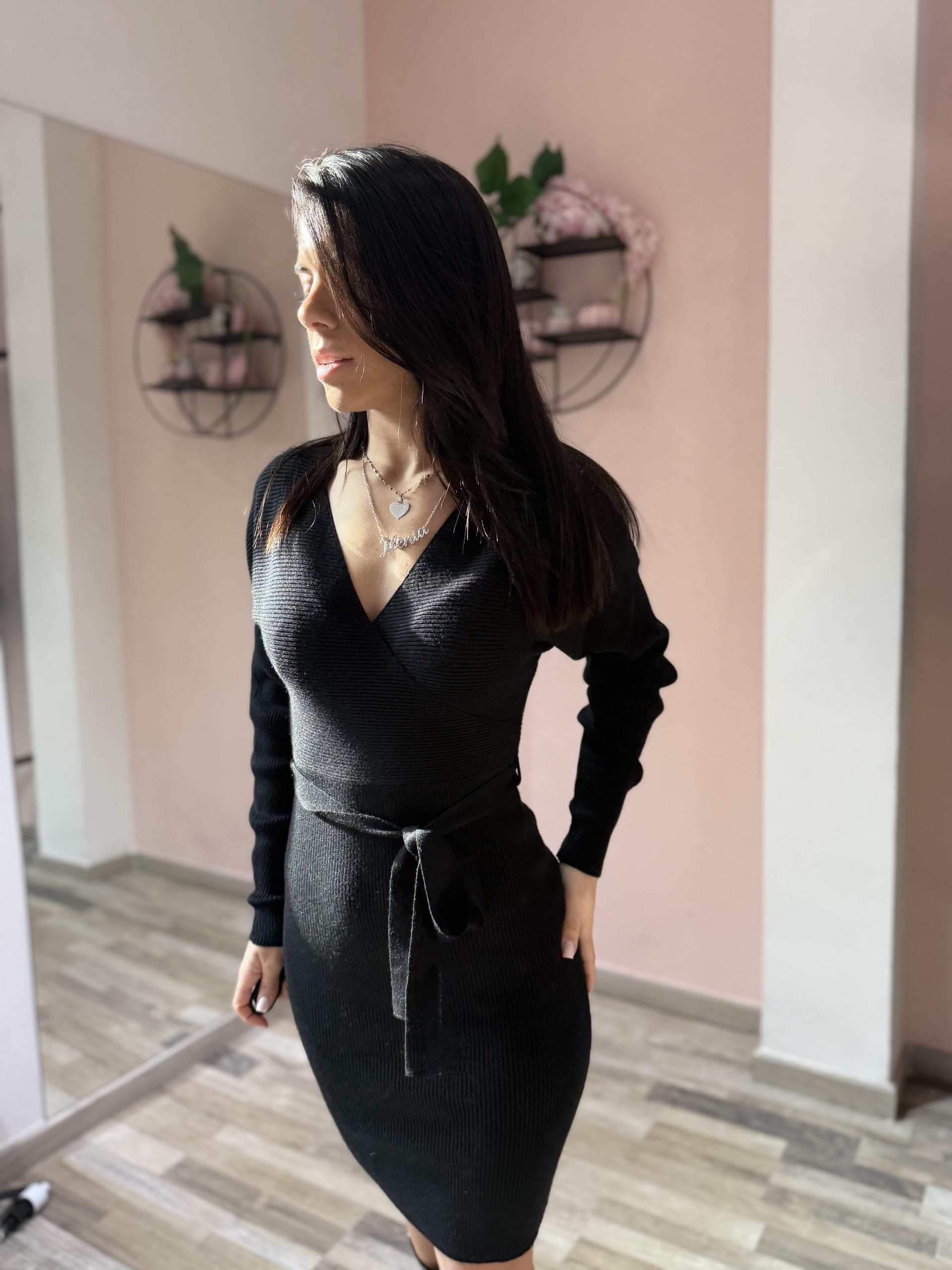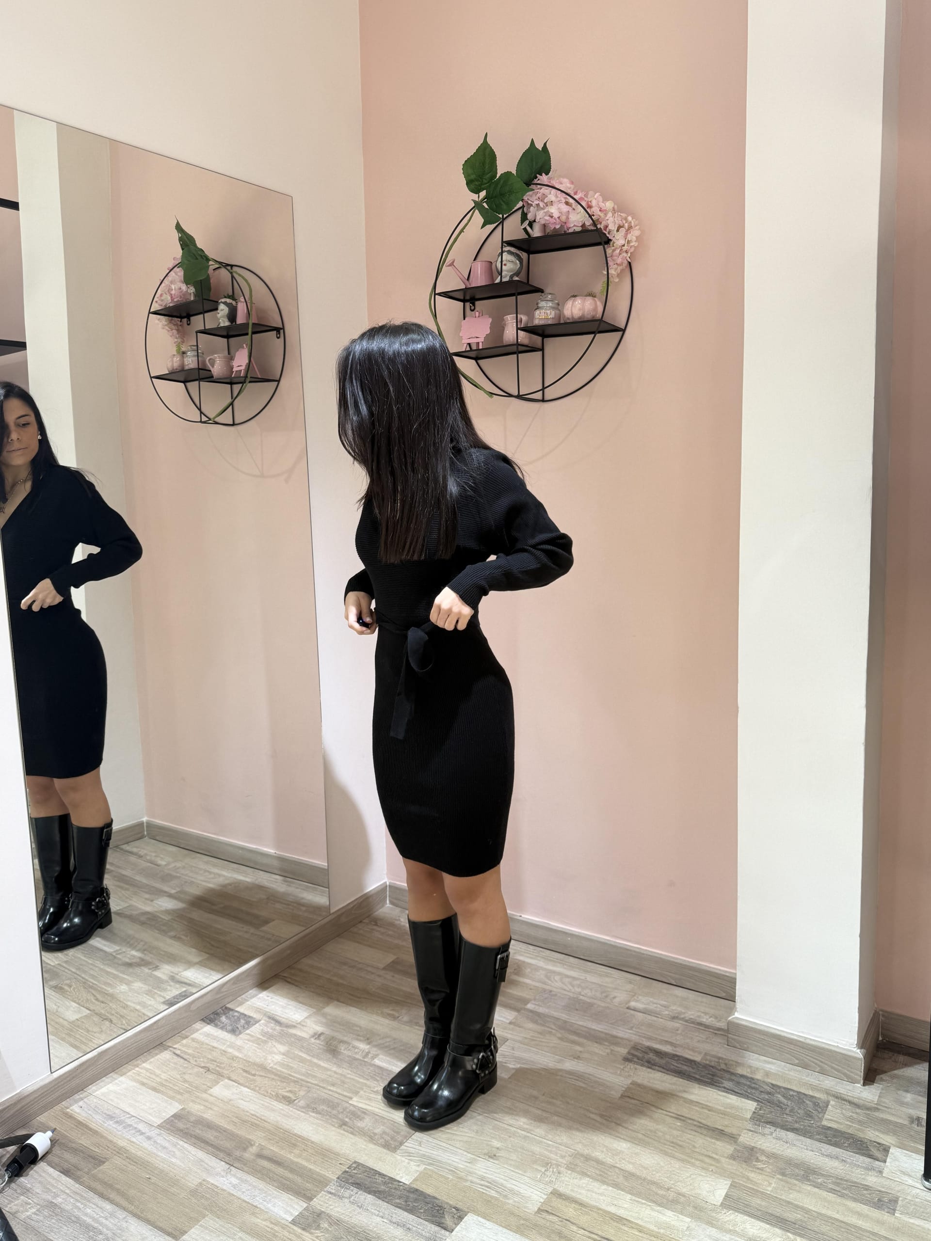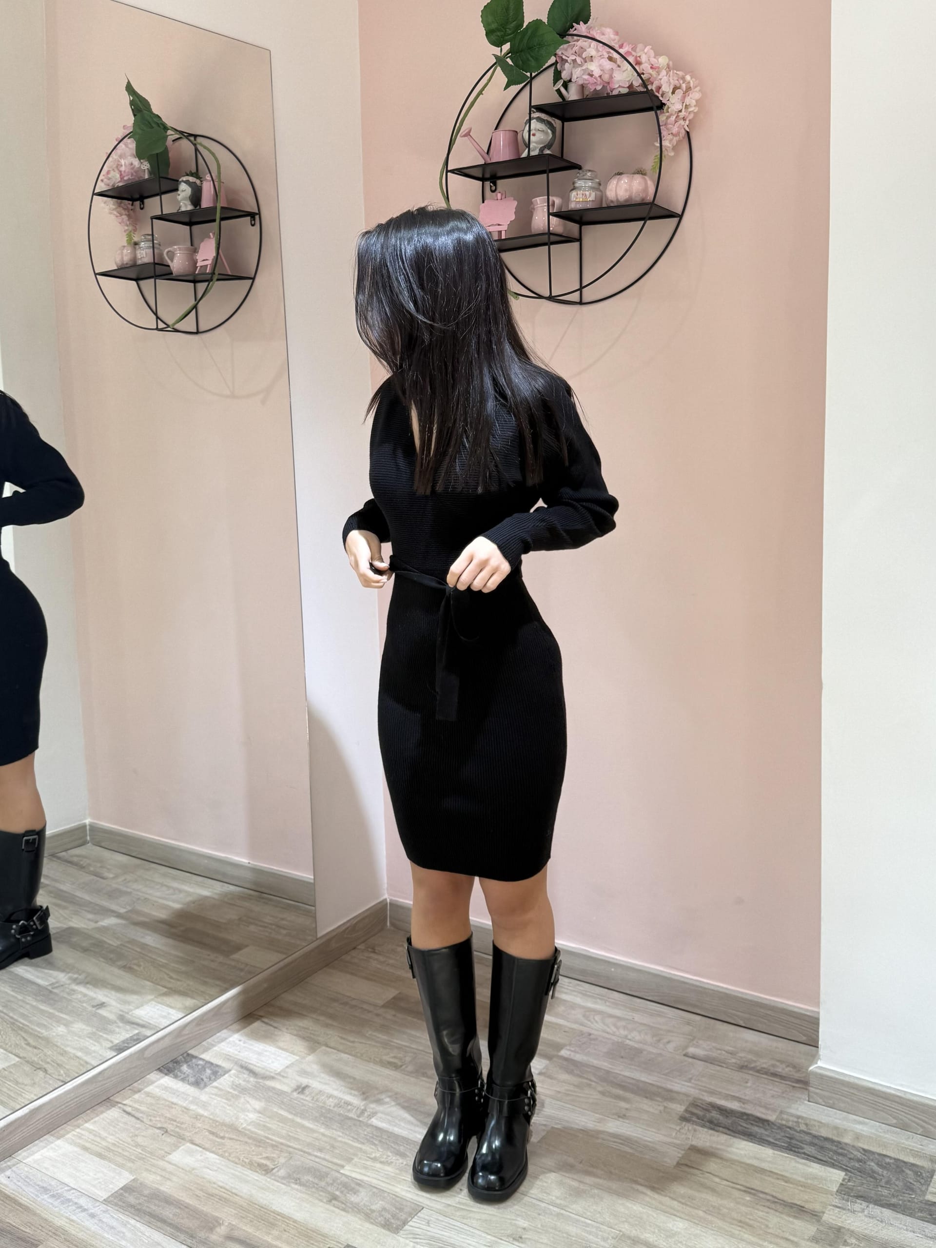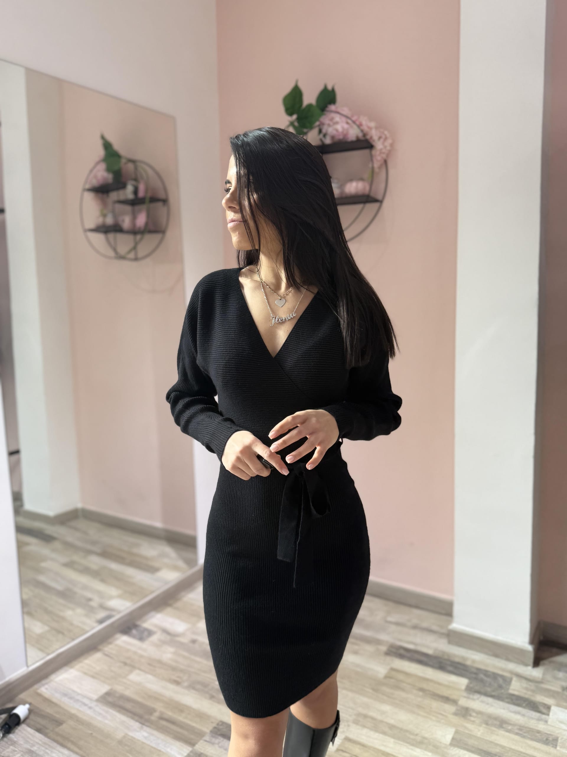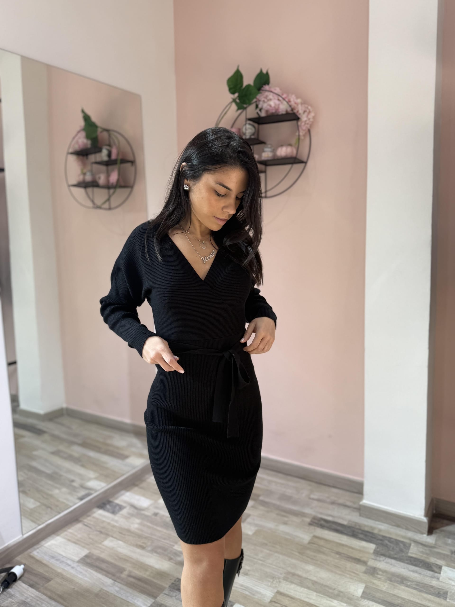 Abito dal design raffinato e femminile, realizzato in tessuto a costine elasticizzato che valorizza la silhouette. La vestibilità attillata esalta le forme con naturalezza, mentre lo scollo a V dona slancio ed eleganza. Il cinturino in vitadefinisce il punto vita, aggiungendo un dettaglio delicato e armonioso. Un capo versatile, ideale sia per il giorno che per la sera, perfetto da abbinare a stivali o décolleté.