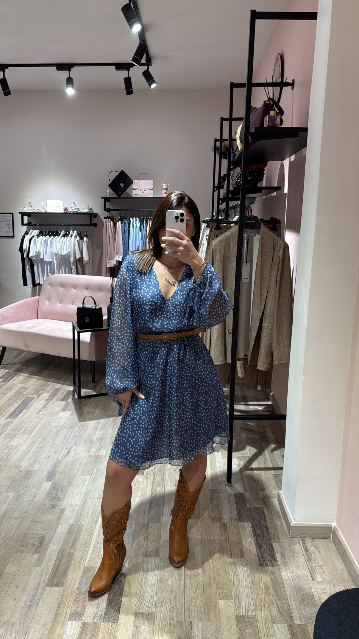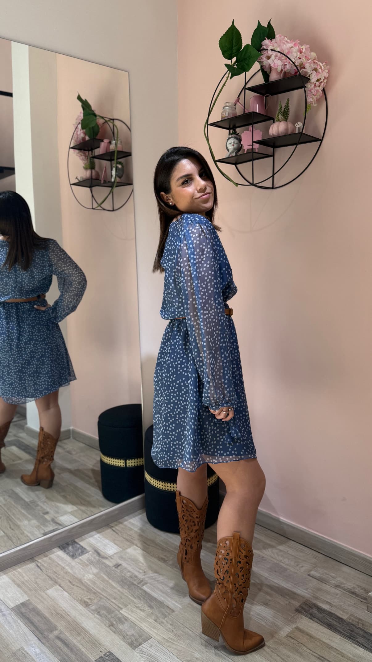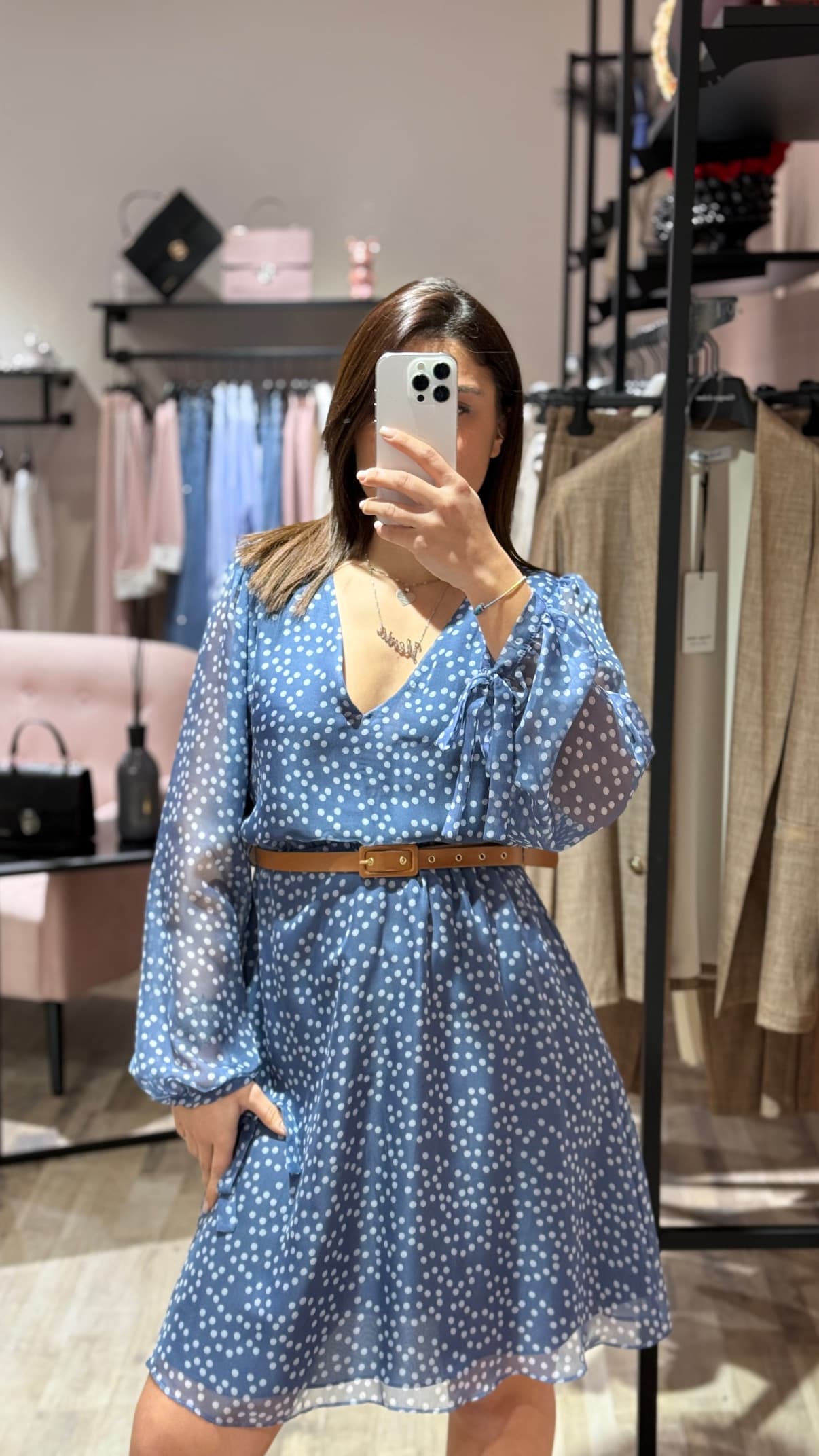 Abito corto con scollo a V, maniche ampie con polsini e vita elastica. Cintura in simil cuoio e chiusura posteriore con dettaglio a goccia. Stampa a pois per un look senza tempo e versatile.
