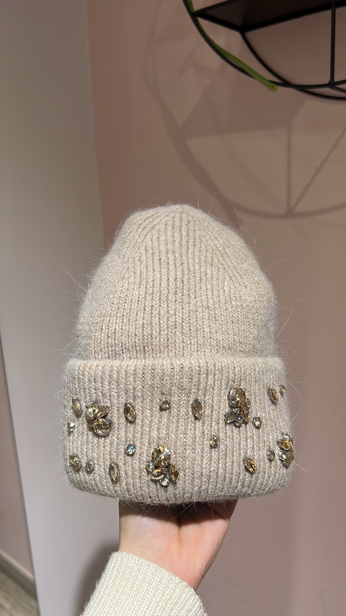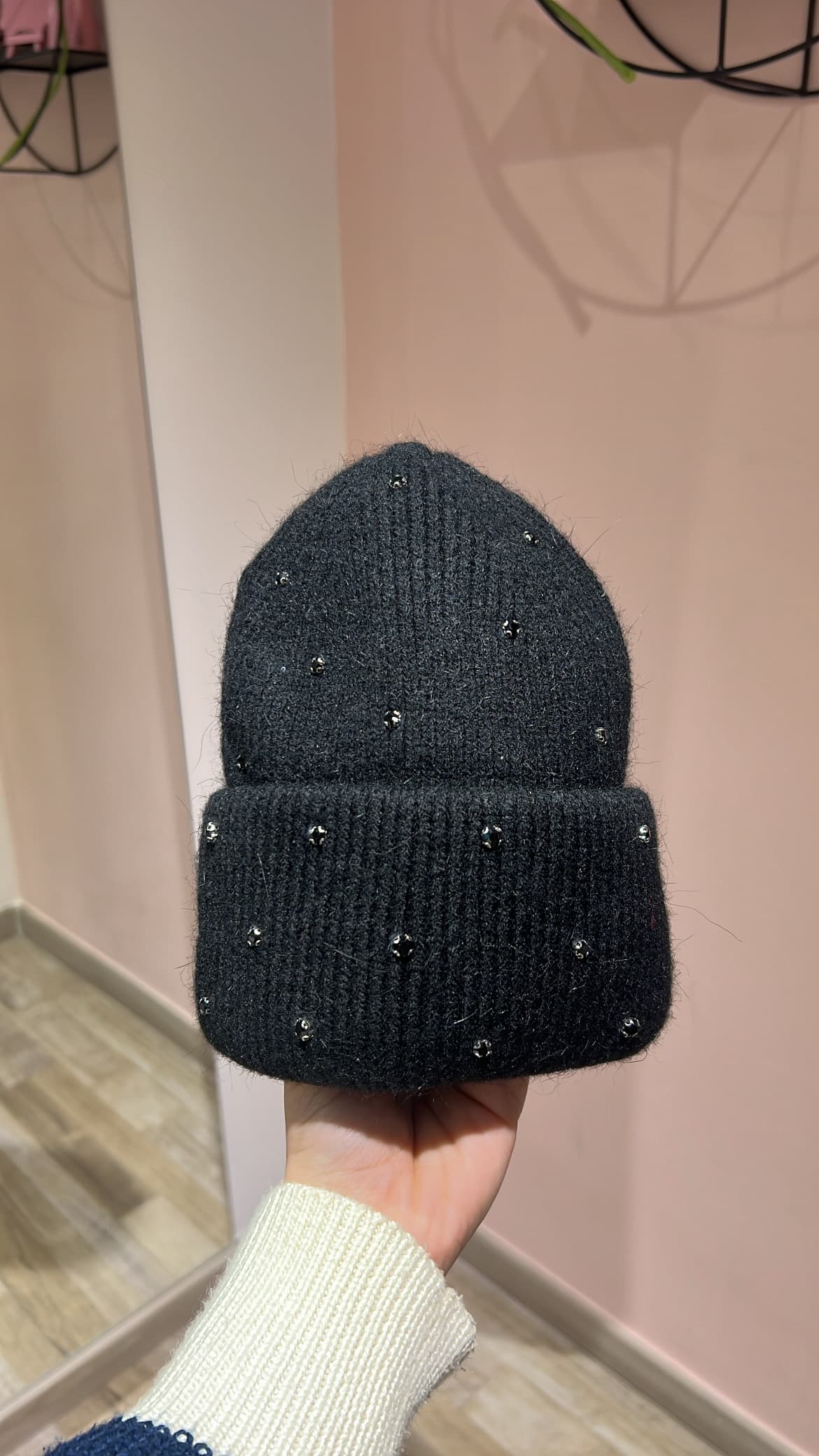 Berretto di lana: caldo e alla moda, impreziosito da applicazioni di strass per un tocco luminoso e glamour. Perfetto per l'inverno!