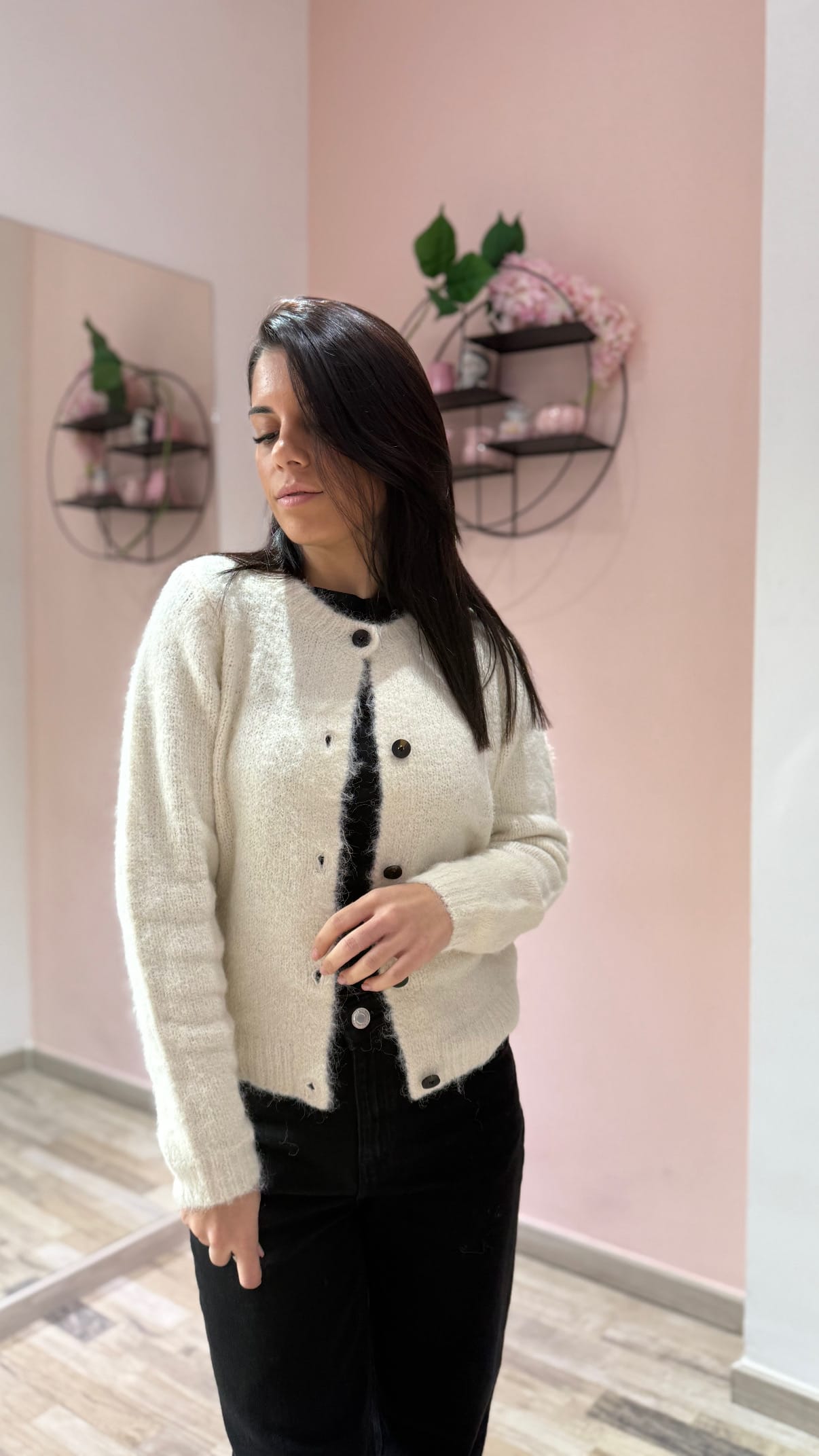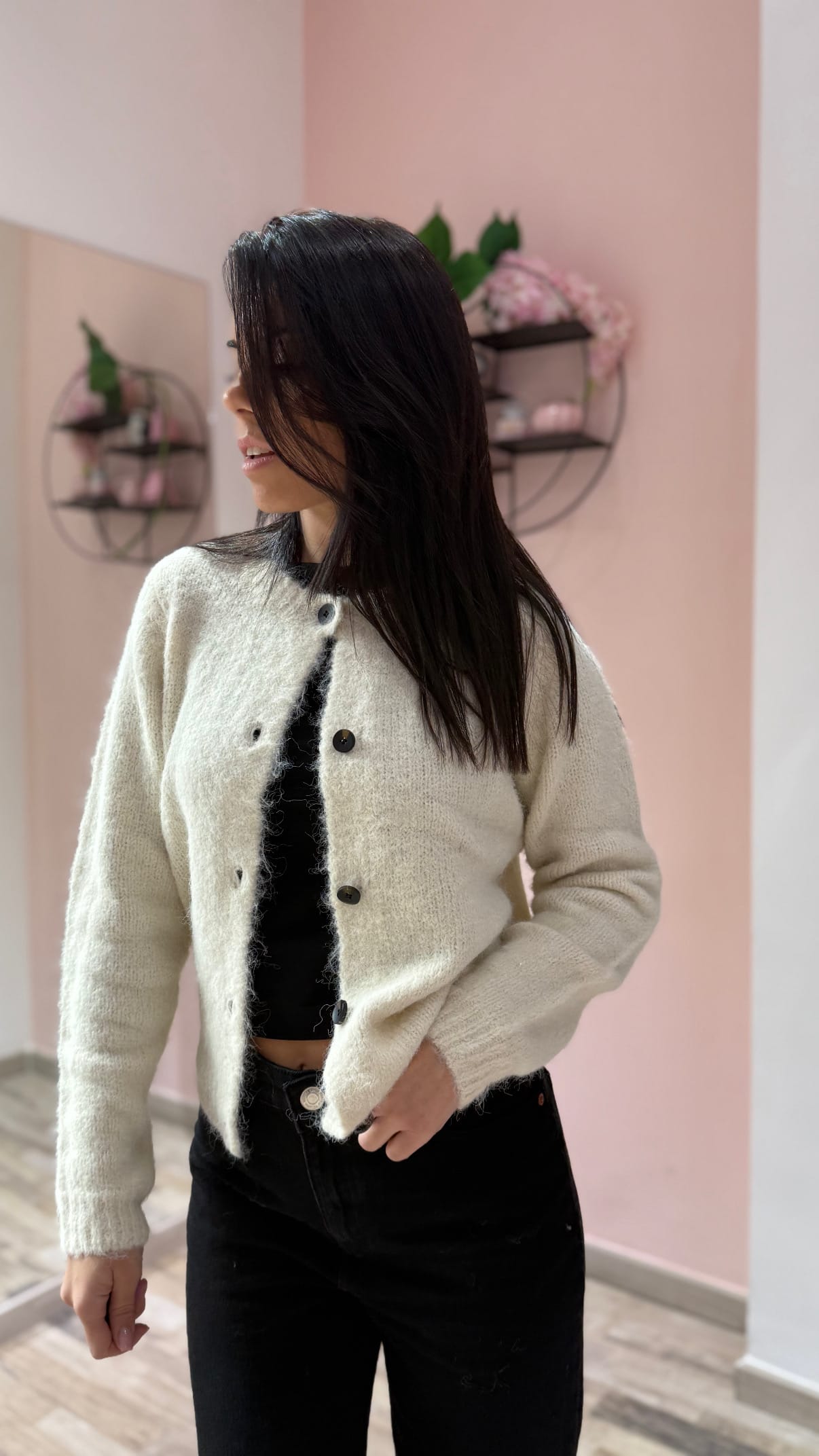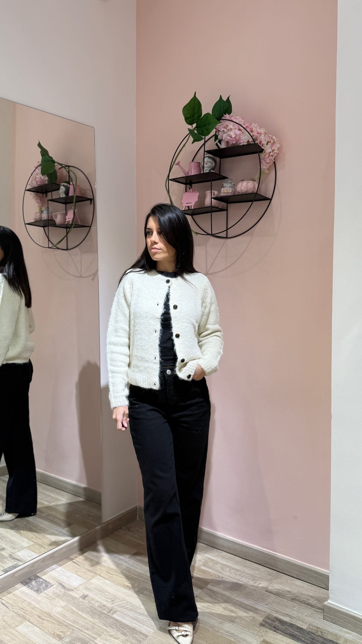 Cardigan dal comfort avvolgente, realizzato in un tessuto morbidissimo, caldo e leggermente pelosetto, ideale per le giornate più fresche. Il design essenziale è arricchito da bottoni neri a contrasto, che donano un tocco raffinato e moderno. La vestibilità confortevole lo rende perfetto da indossare sia aperto che chiuso, per look casual ma curati.