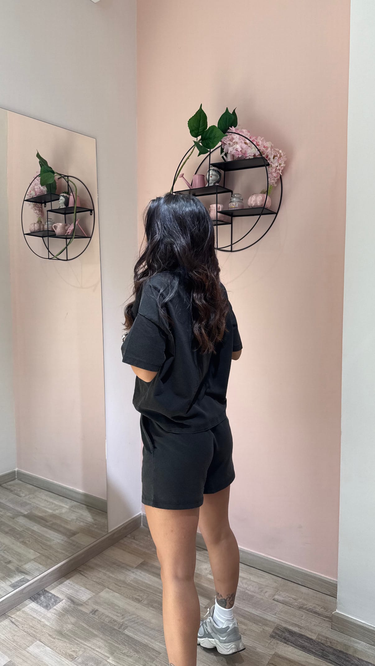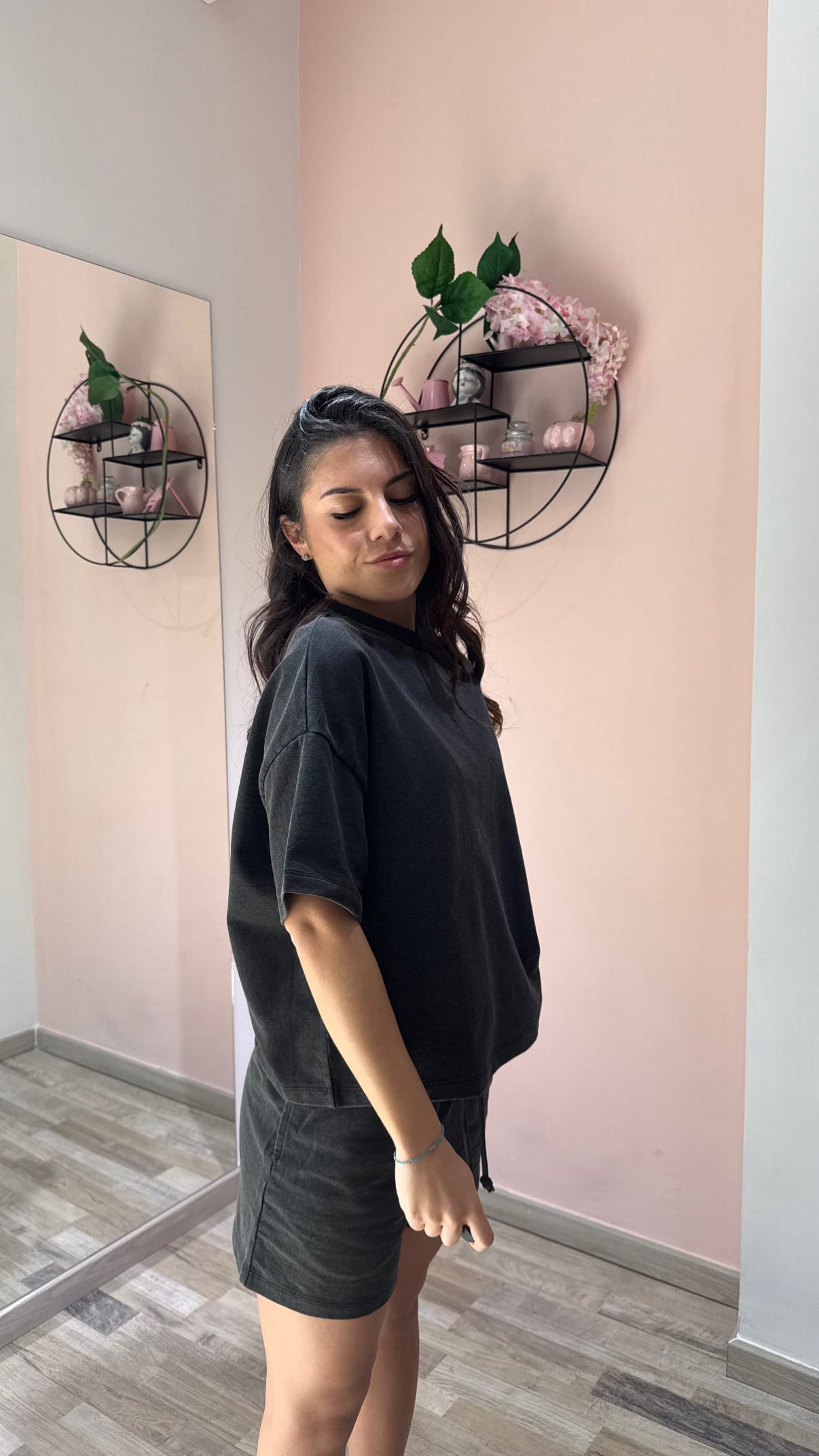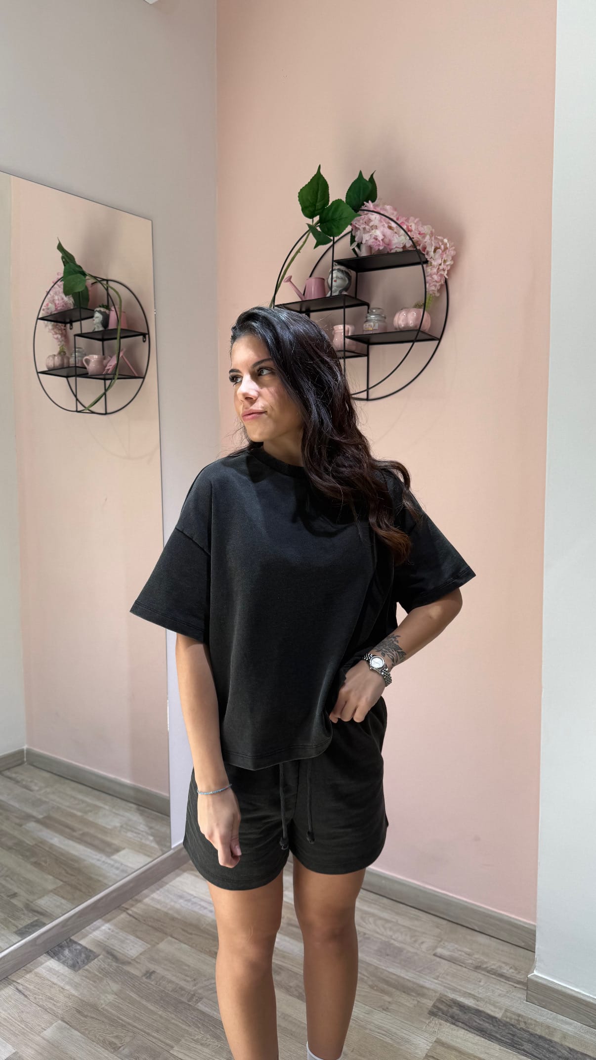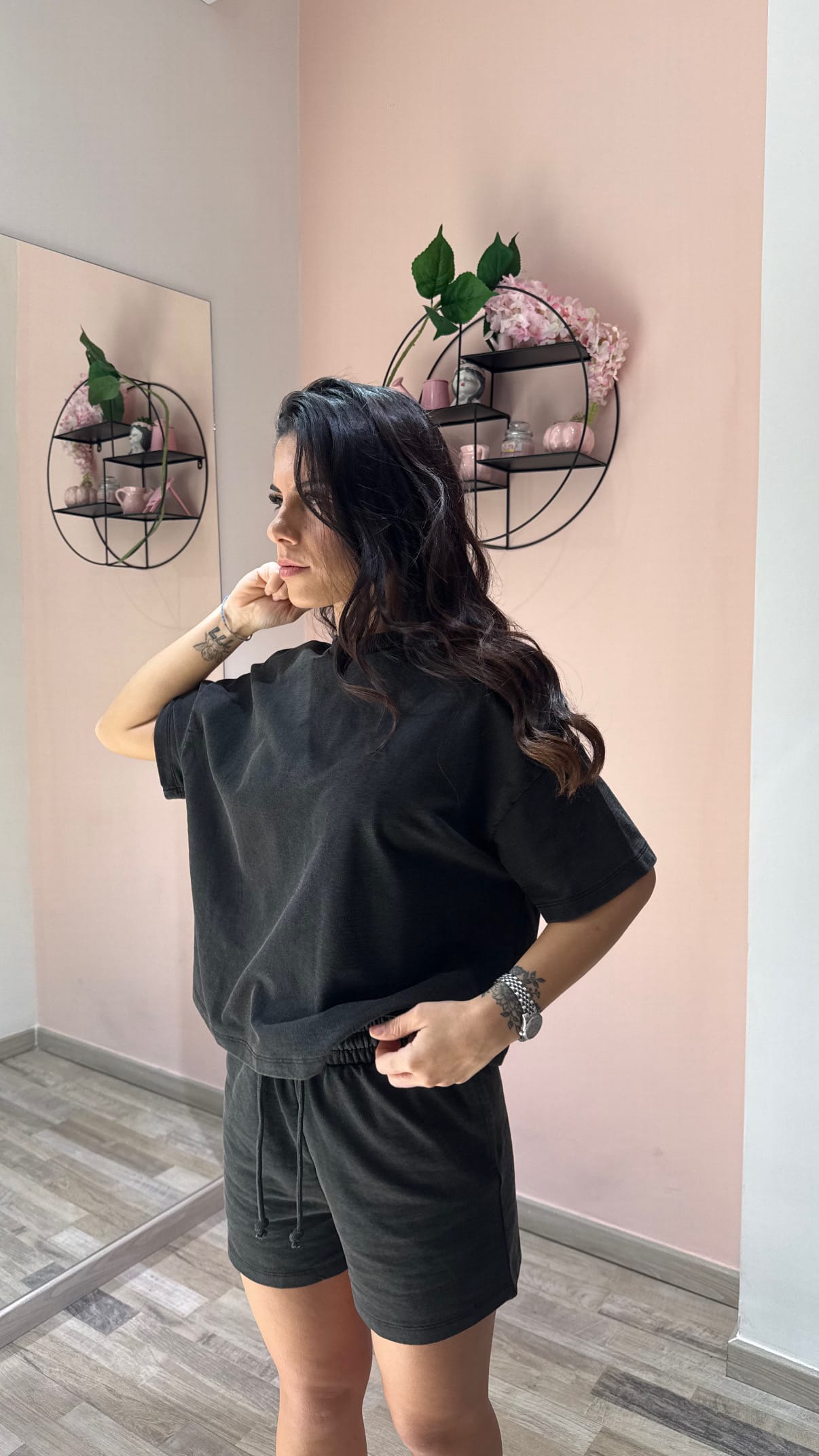 Coordinato sportivo in nero effetto slavato, dal carattere grintoso e contemporaneo, perfetto per chi ama uno stile casual con un tocco urban. Il completo è composto da short con coulisse regolabile in vita, ideali per una vestibilità comoda e adattabile, e da una maglia a manica corta over con spalla calata, che valorizza la silhouette con un fit rilassato e di tendenza.