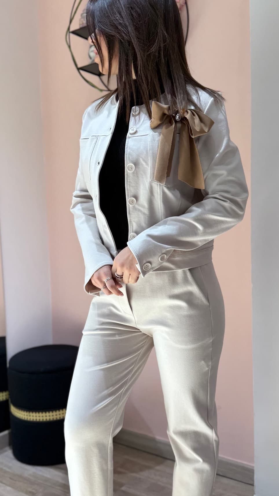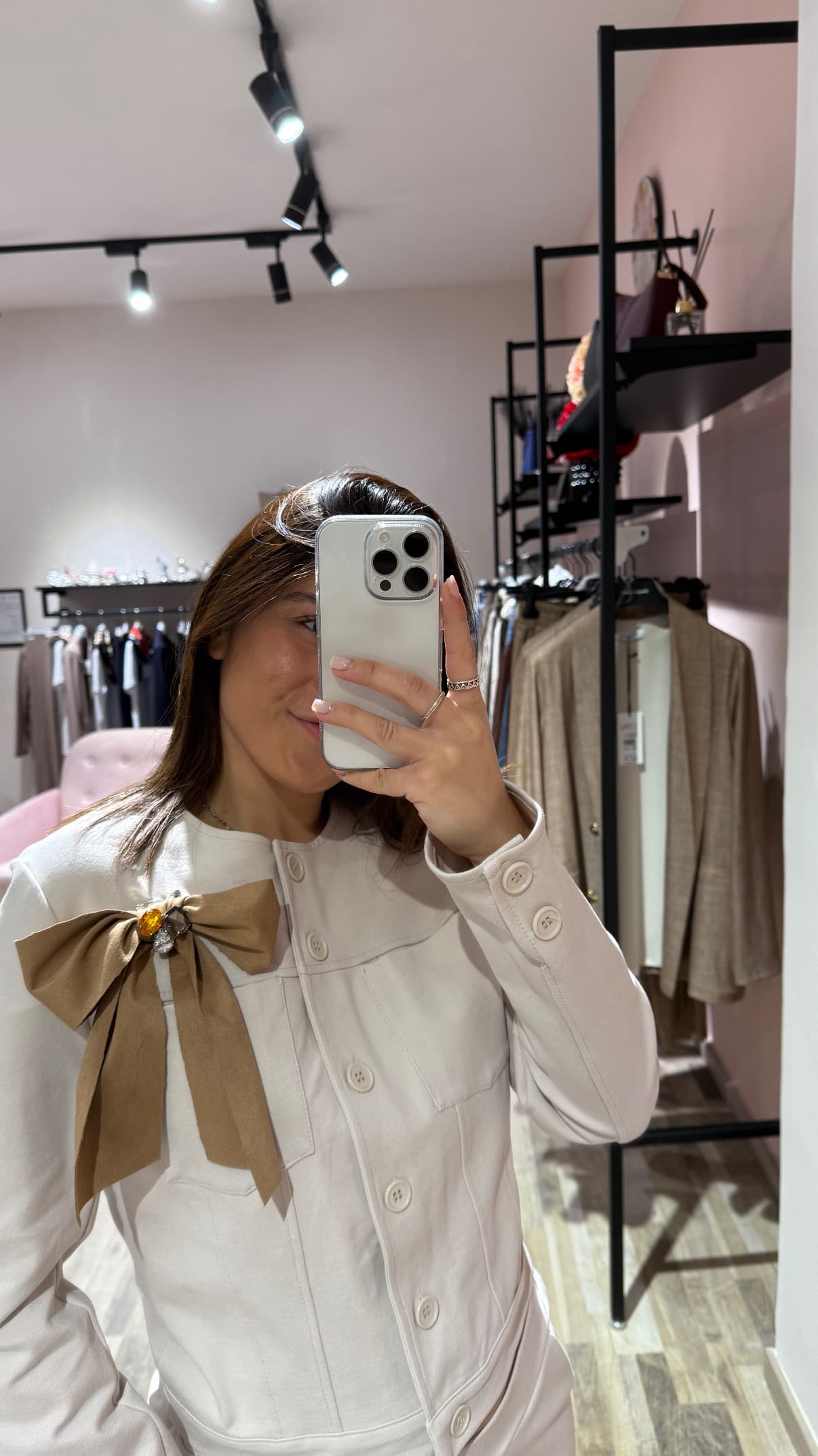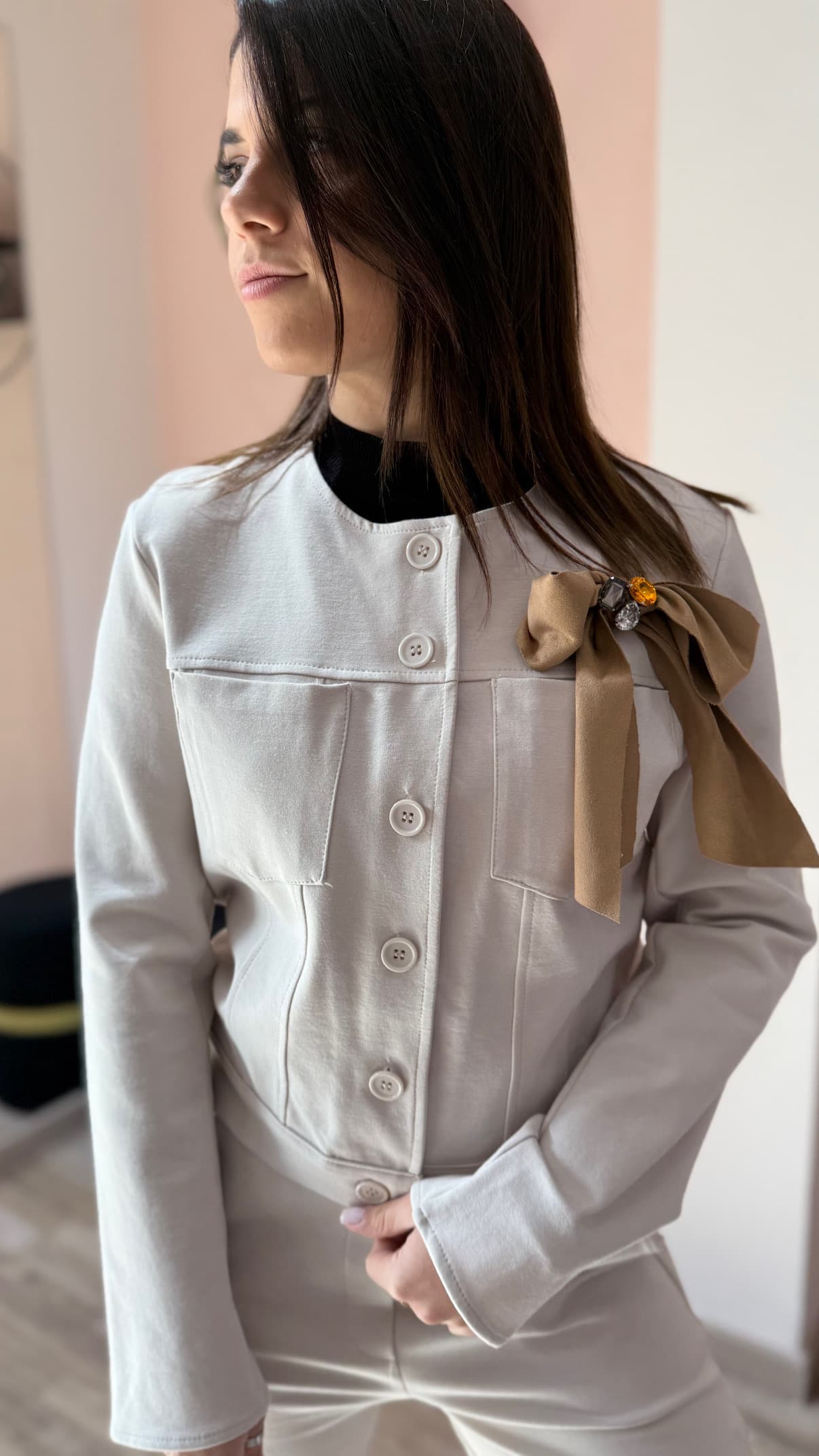 Giacca cropped con girocollo, abbottonatura frontale e tasche anteriori. Spilla fiocco in dainetto con applicazioni gioiello per un tocco raffinato.