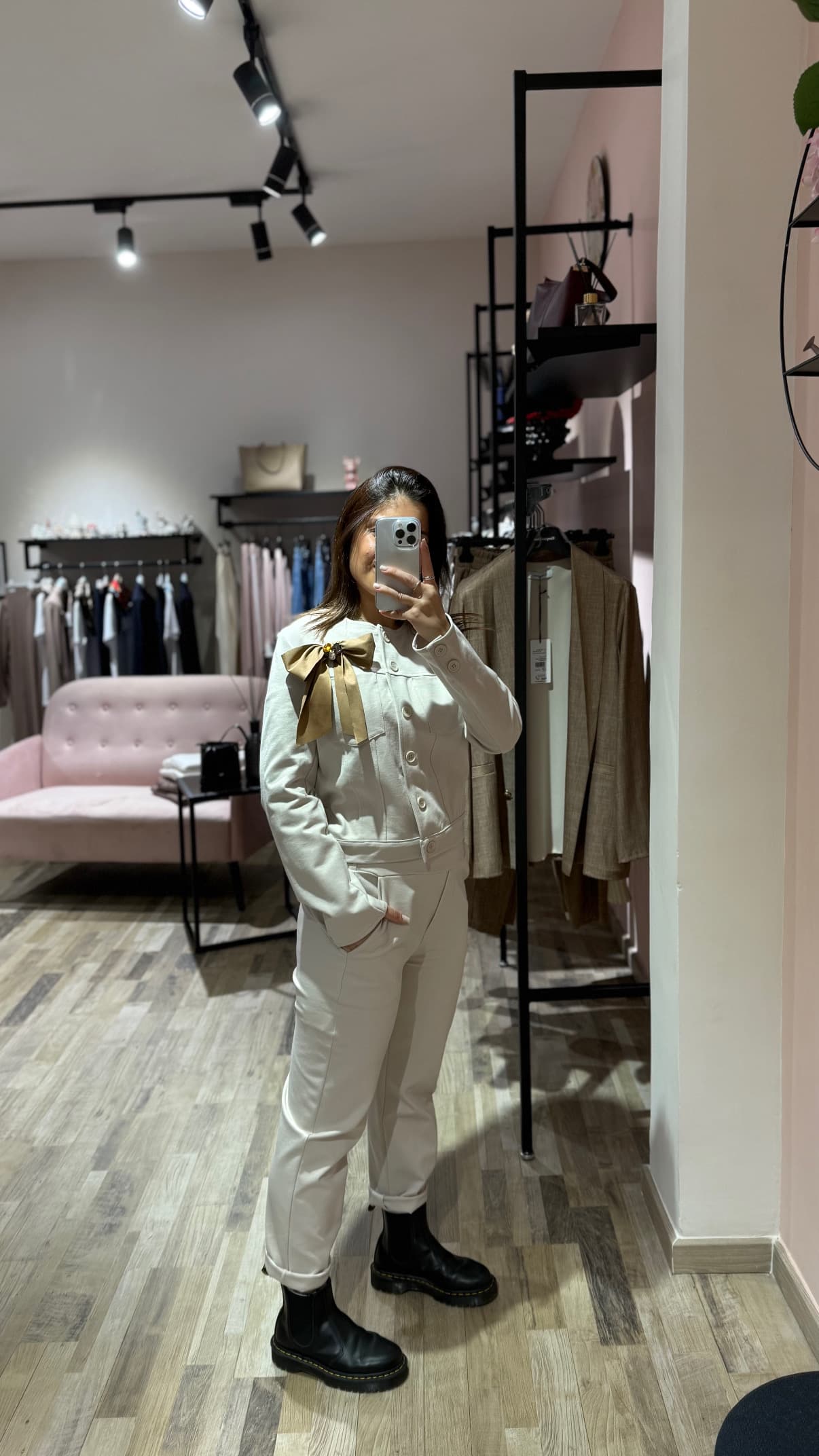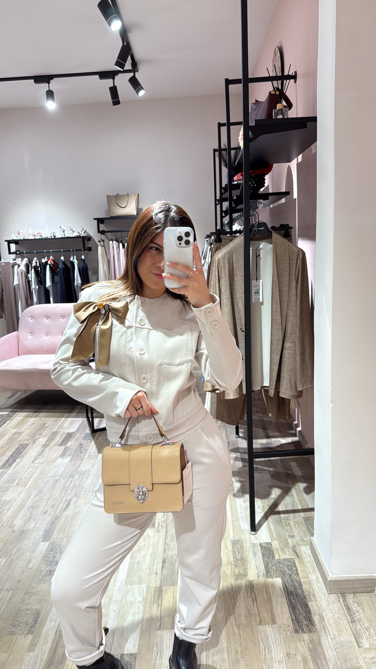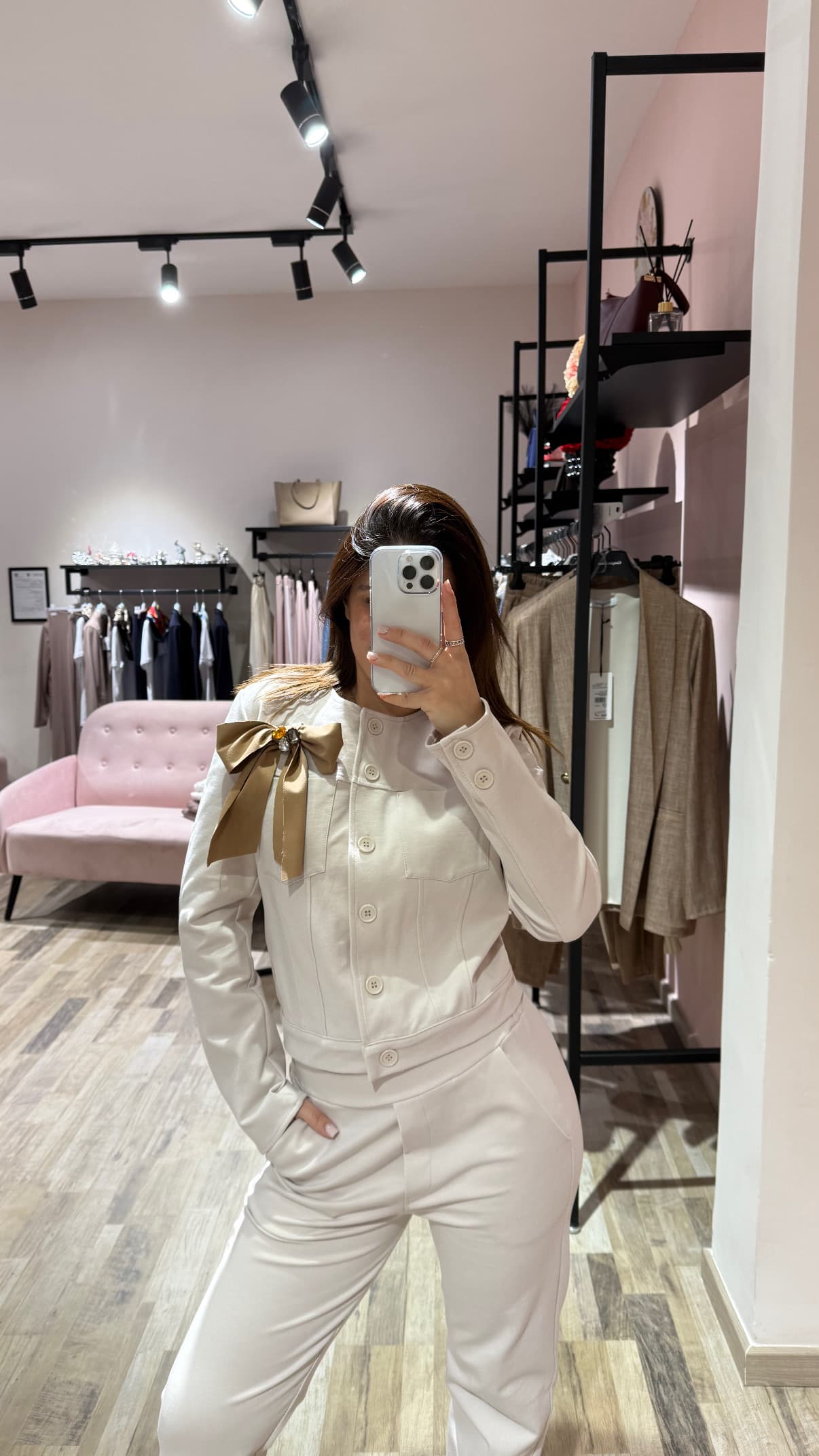 Giacca cropped con girocollo, abbottonatura frontale e tasche anteriori. Spilla fiocco in dainetto con applicazioni gioiello per un tocco raffinato.