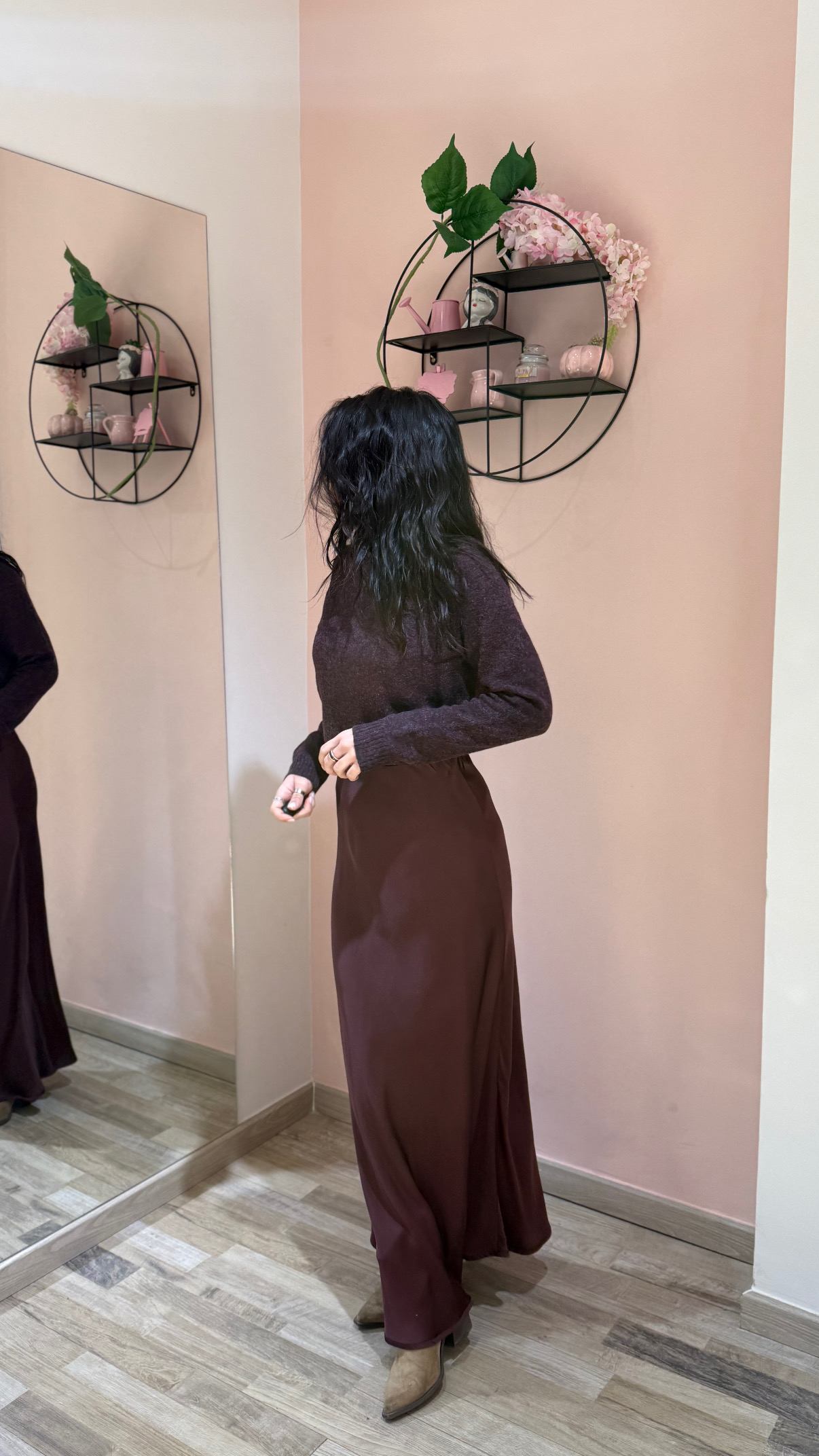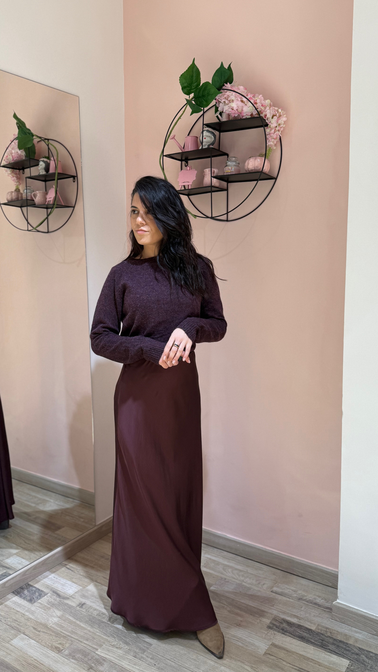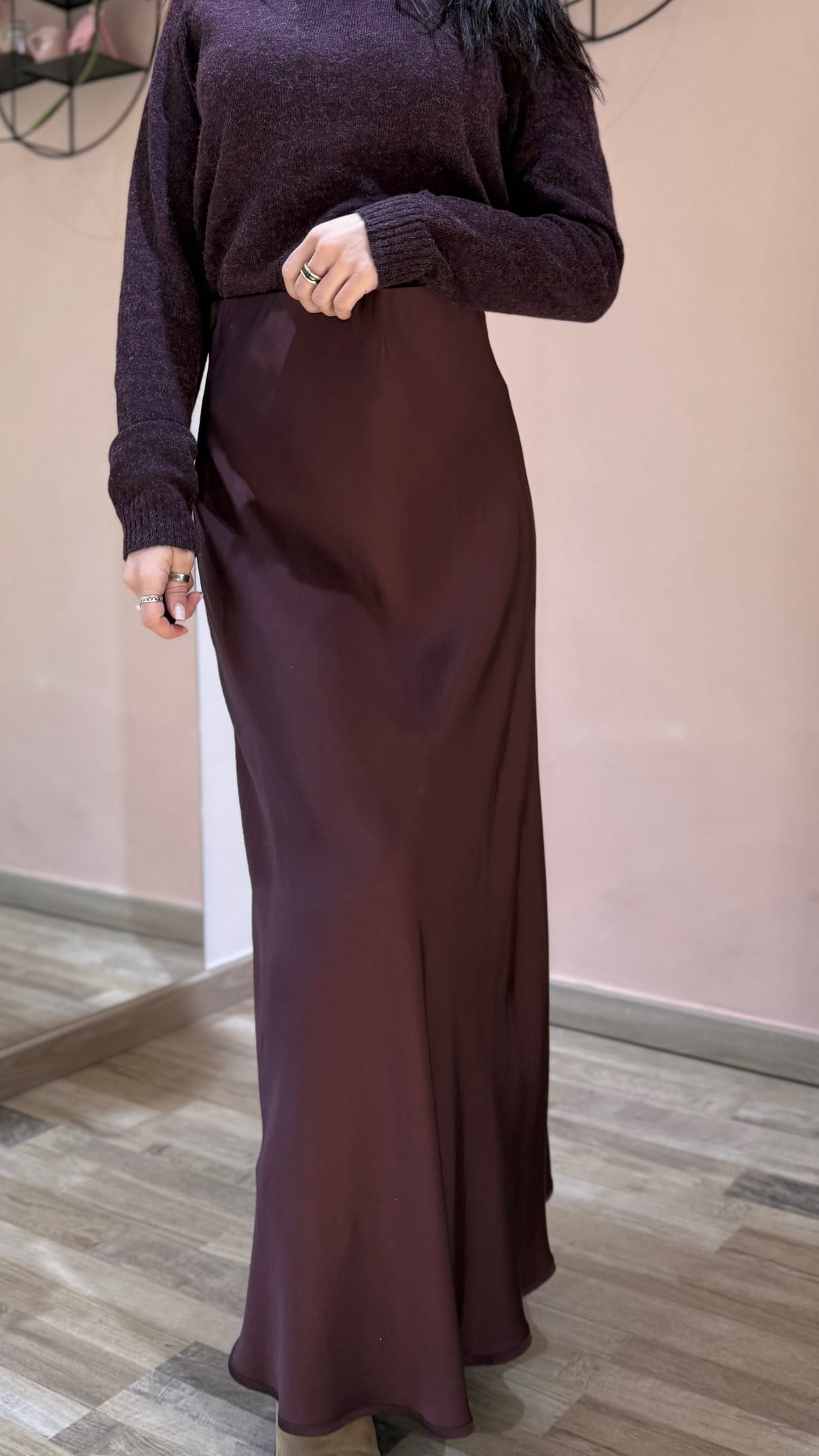 Gonna lunga in raso di viscosa, modello vita alta elastica. Taglio in sbiego. Linea dritta. Vestibilità regolare.
