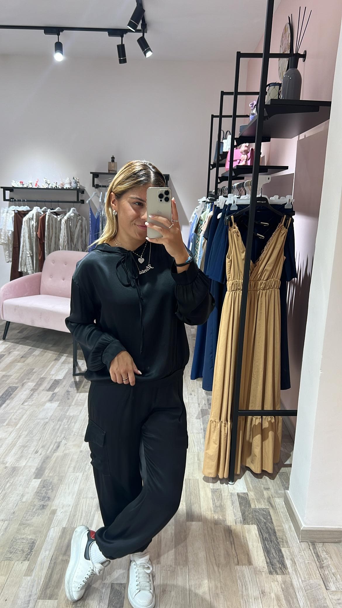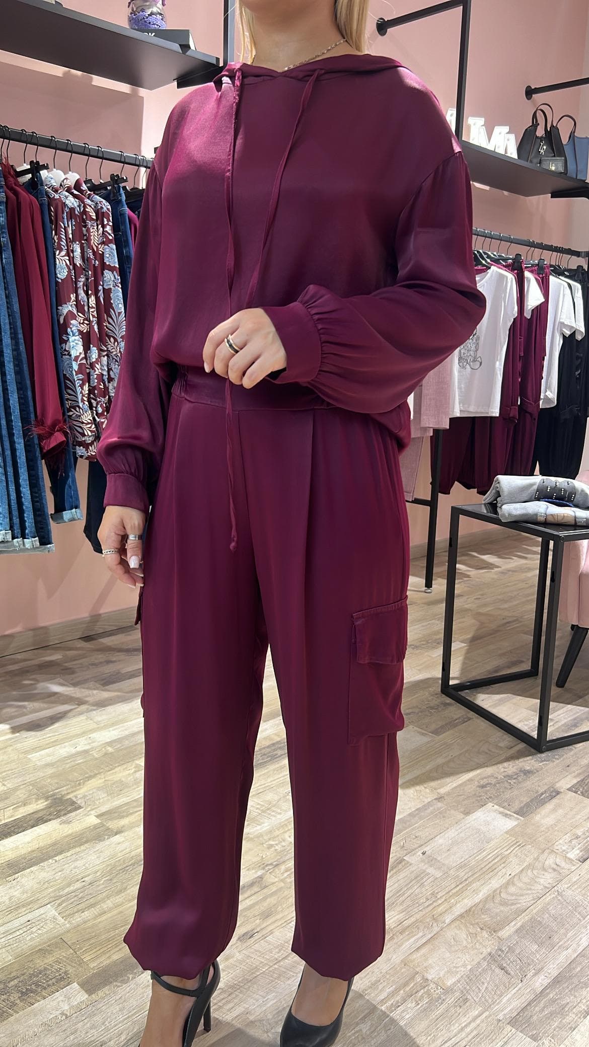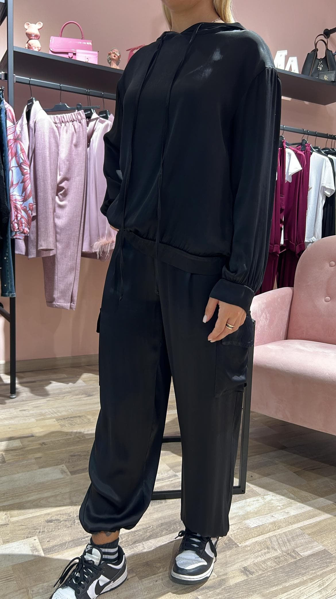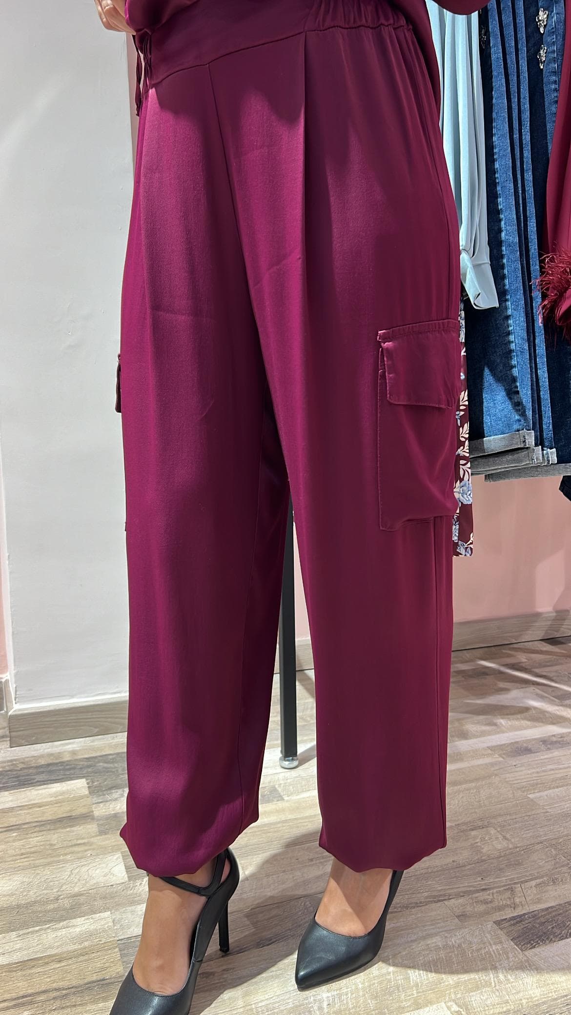 Pantalone in raso, modello jogger vita alta elasticizzata . Tasche laterali. Orlo con polsino elastico. linea comoda. Vestibilità regolare.