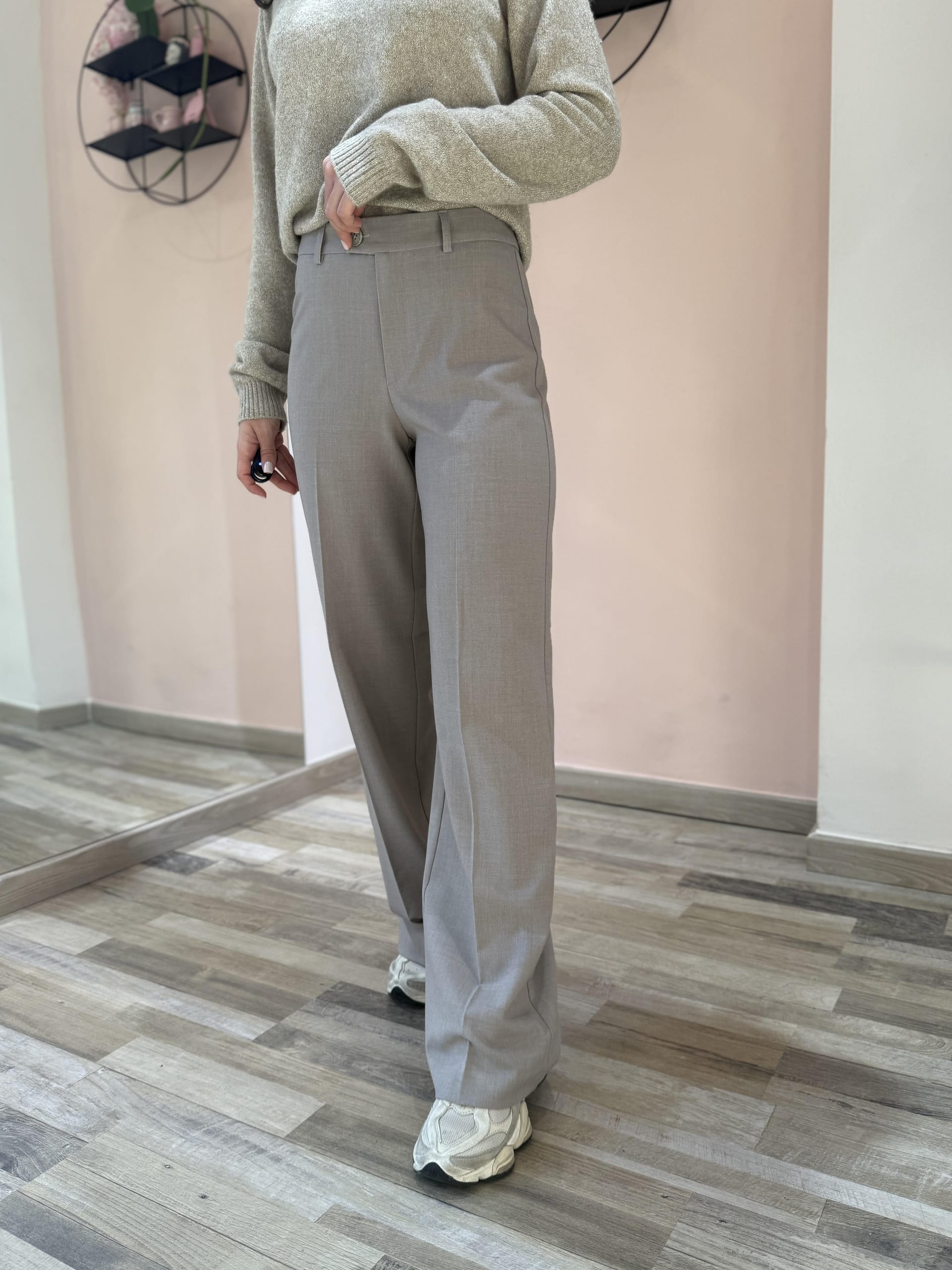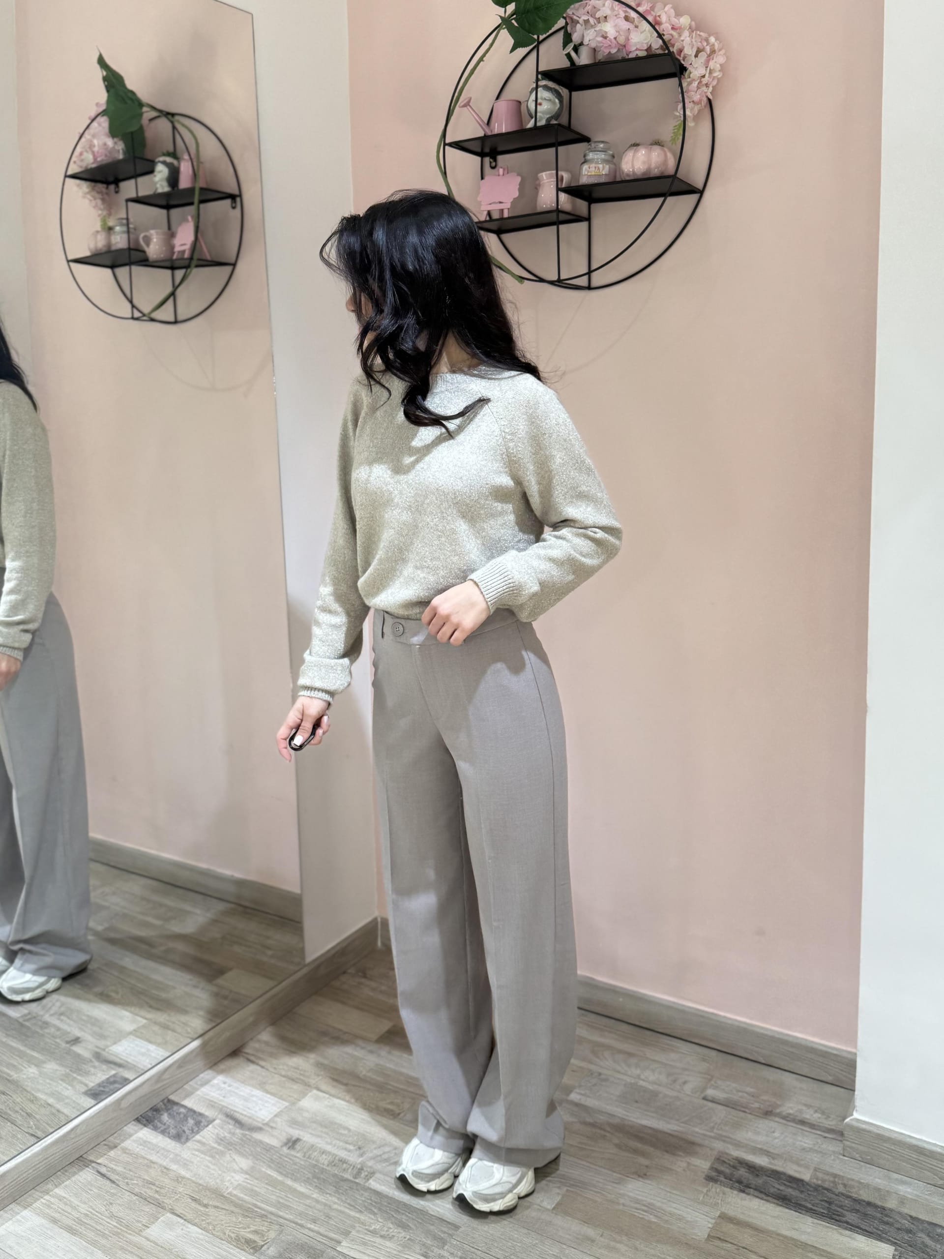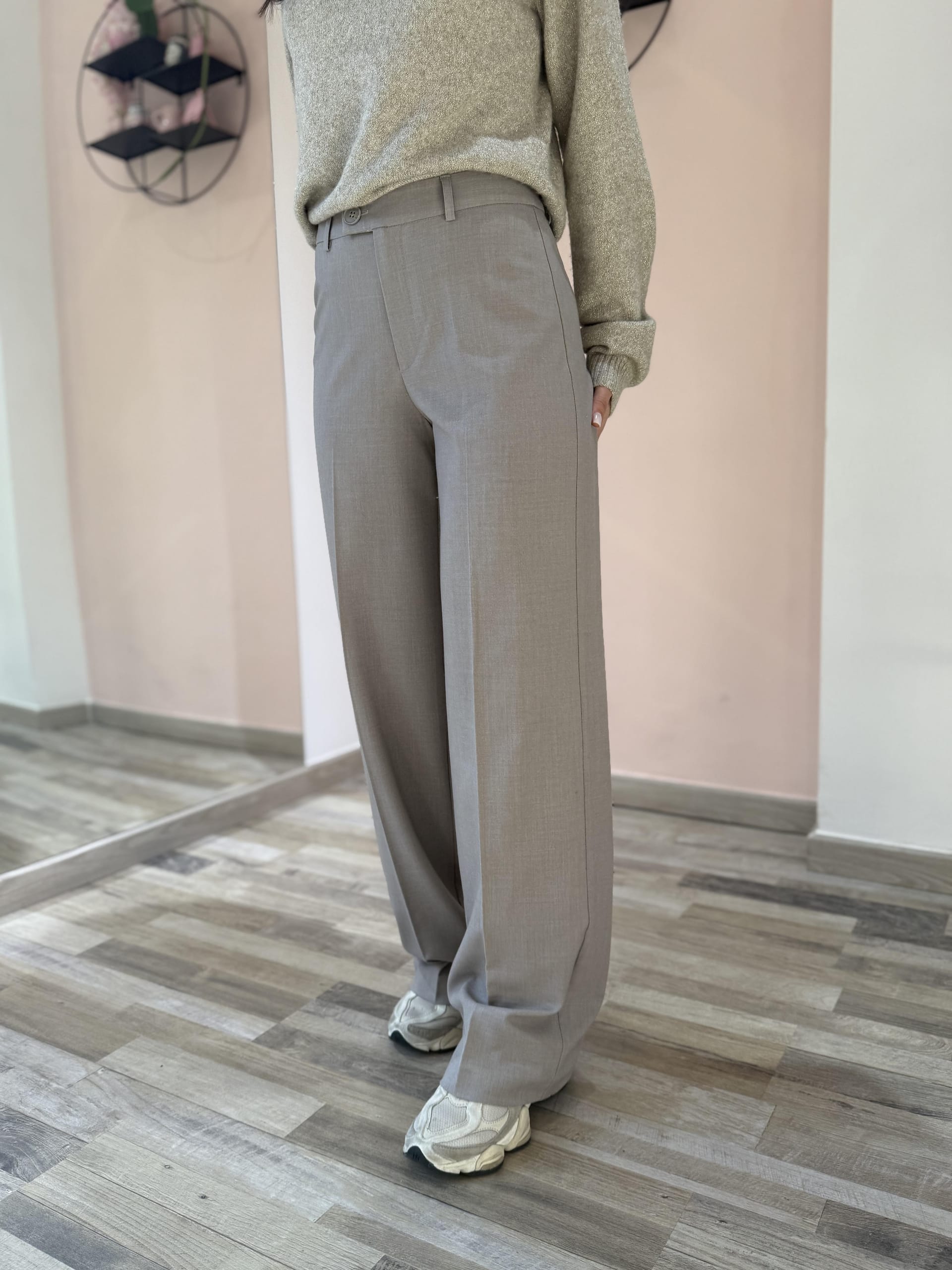 Pantalone dal design contemporaneo, caratterizzato da una linea a palazzo con gamba ampia e fluida che slancia la silhouette. Il bottone decentrato aggiunge un dettaglio originale e raffinato, donando personalità al capo senza rinunciare all’eleganza. La vestibilità confortevole lo rende perfetto per look sia casual che più ricercati.
