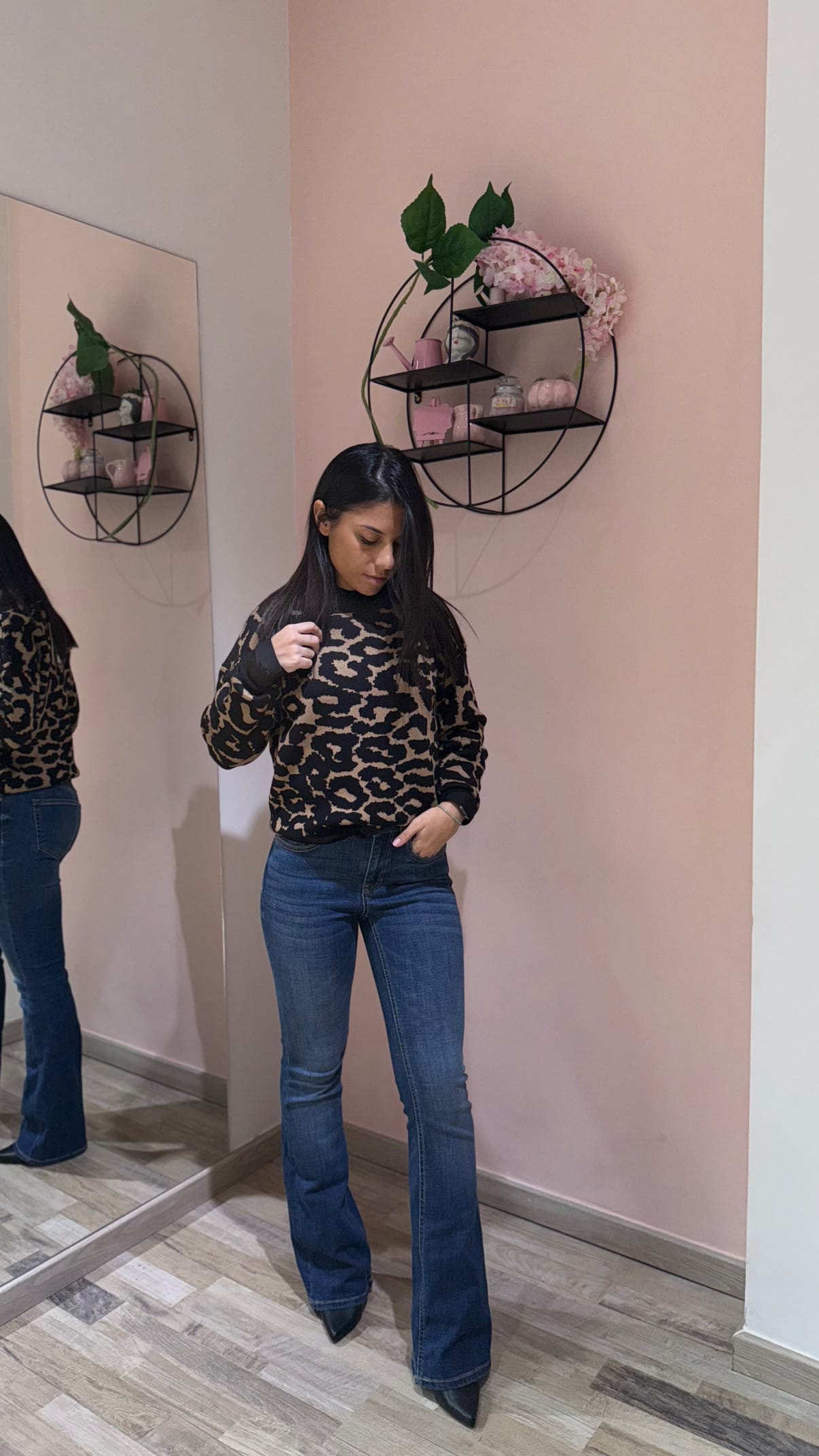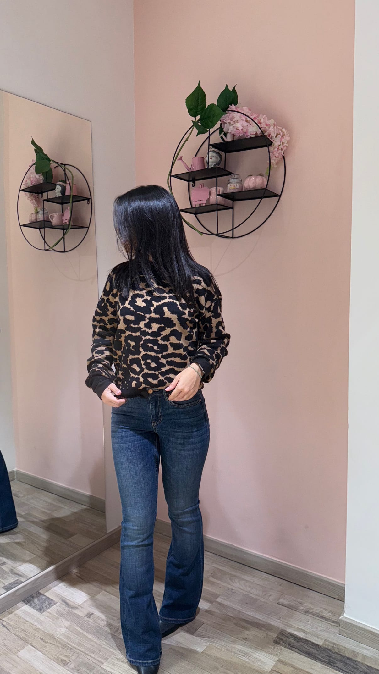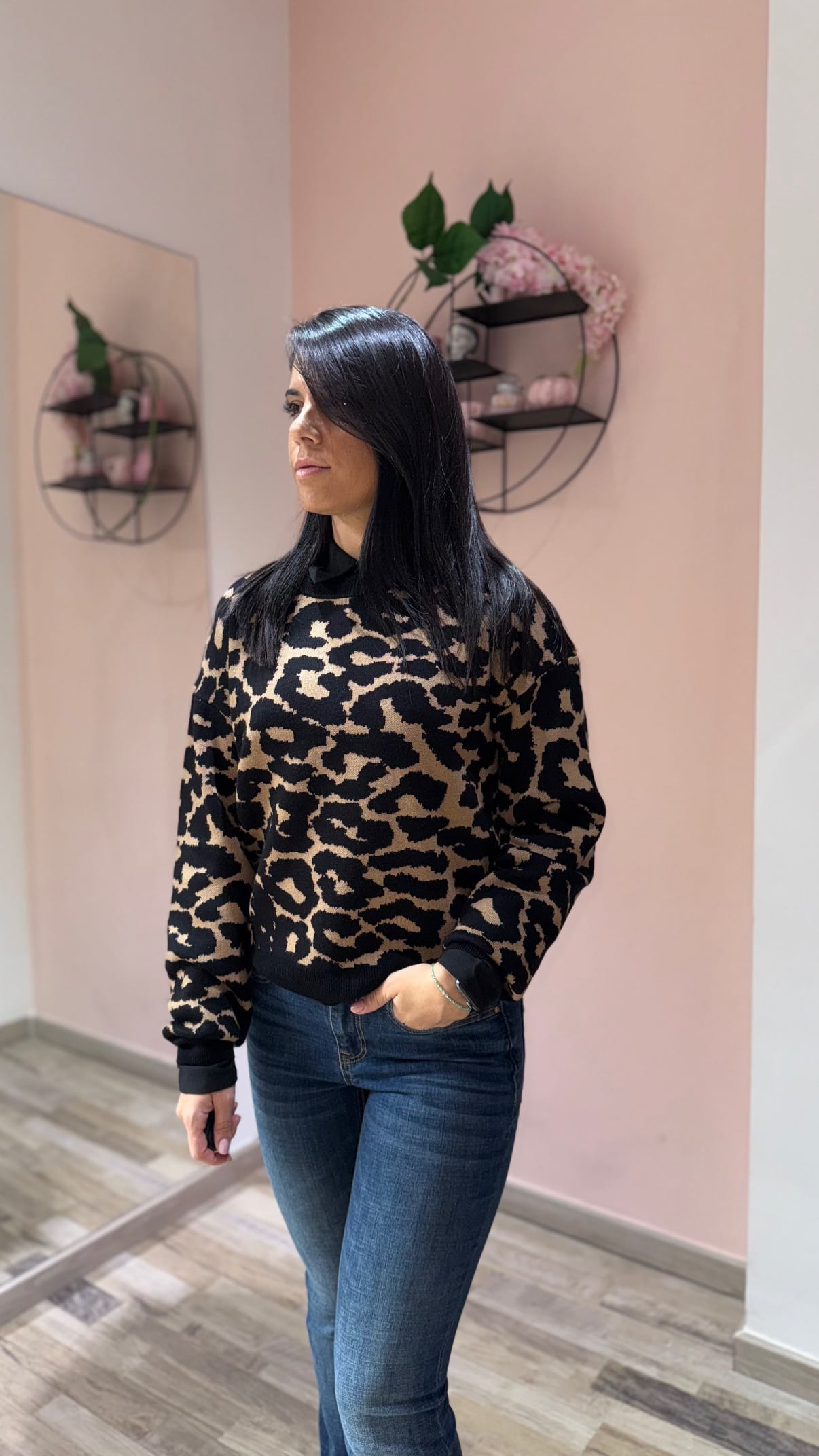 Pullover dal design moderno e grintoso, caratterizzato da una fantasia maculata che dona un tocco deciso e di tendenza. Il girocollo classico e i polsini neri a contrasto aggiungono un dettaglio raffinato, garantendo al tempo stesso comfort e vestibilità. Realizzato in un morbido tessuto misto che assicura calore e piacevolezza al tatto, è perfetto per look casual o urban chic.