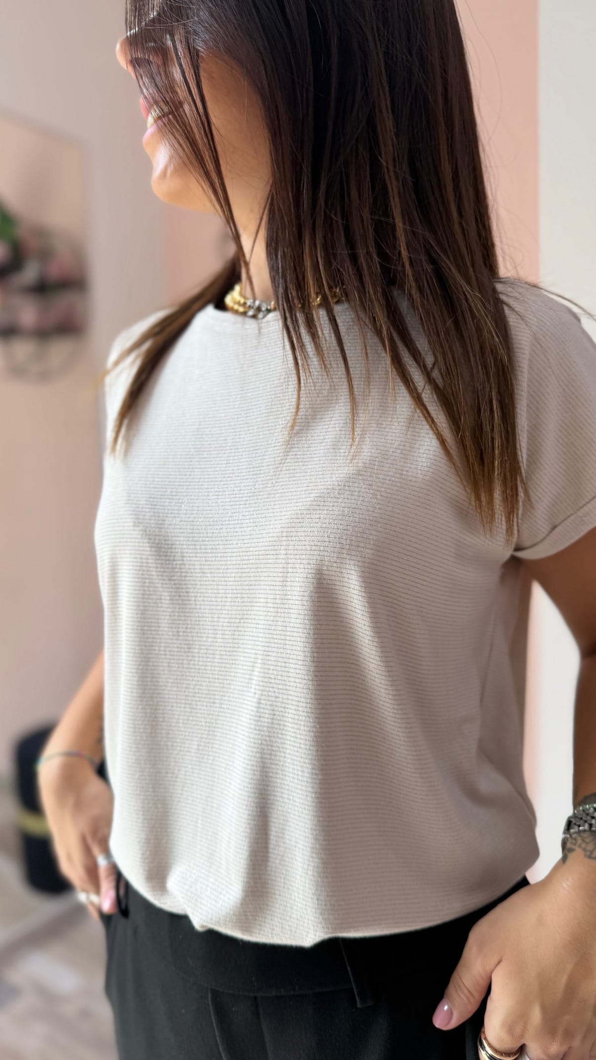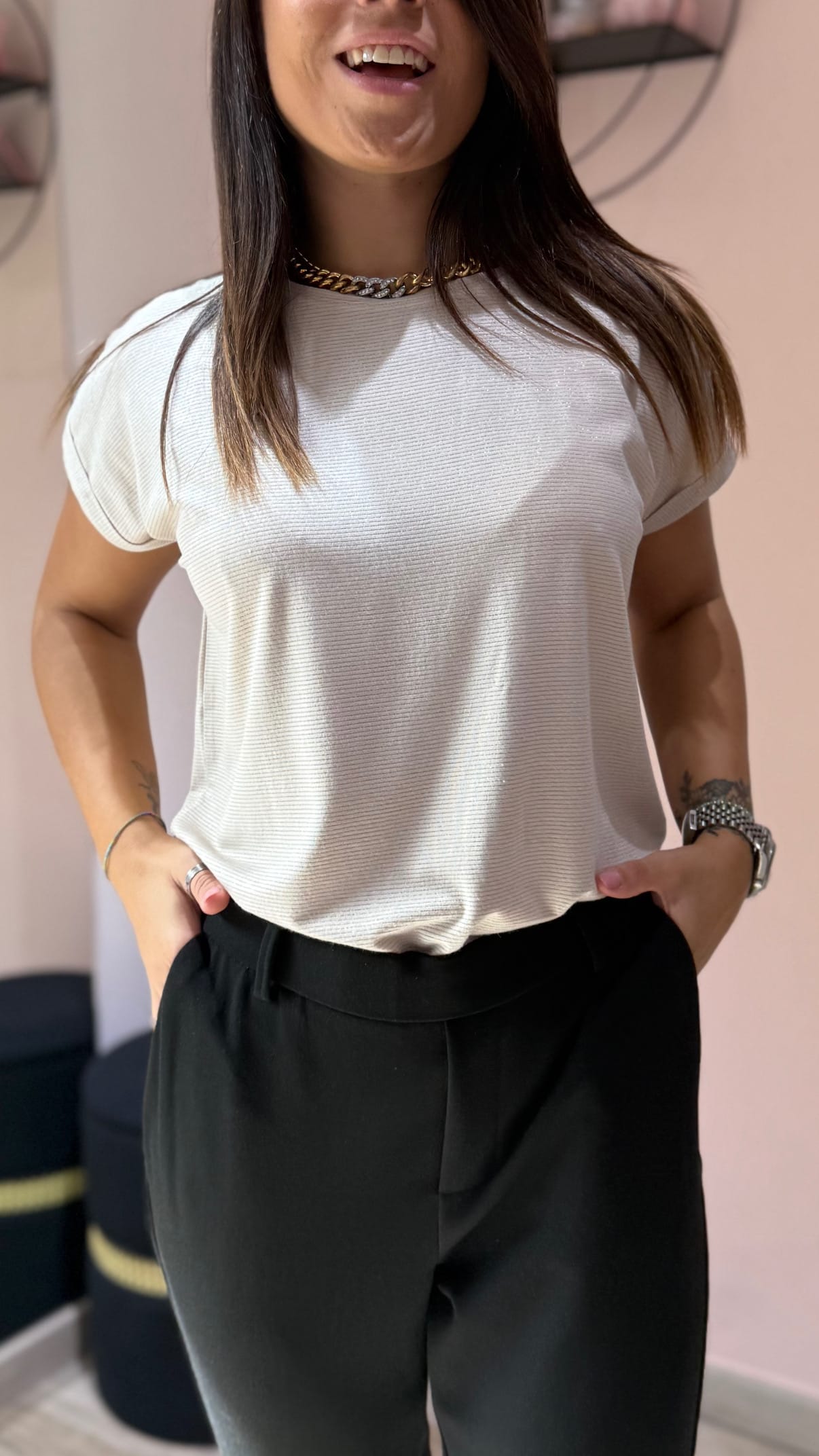 T-shirt a righe con dettagli glitter, perfetta per aggiungere un tocco di luce al tuo look quotidiano. Realizzata con tessuto morbido e leggero, offre una vestibilità ampia e rilassata, ideale per chi ama sentirsi comodo senza rinunciare allo stile. Le righe glitterate catturano la luce in ogni movimento, rendendo questa maglia un capo versatile sia per il giorno che per la sera.